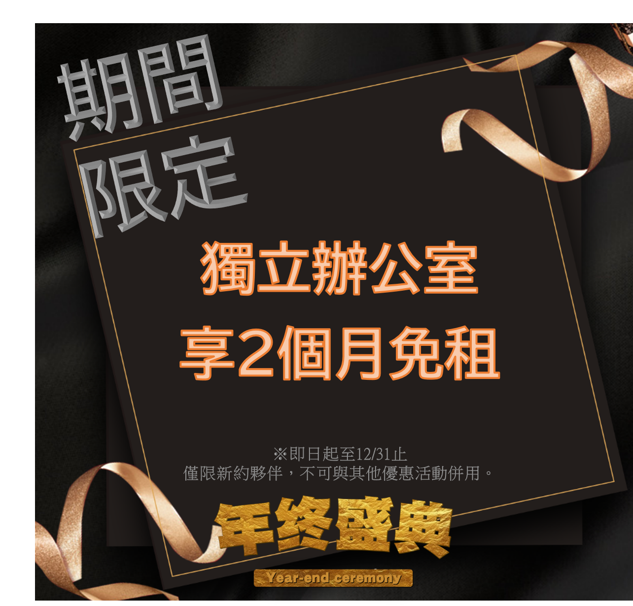 即日起至12/31截止新朋友進駐獨立辦公室最高享2個月免租